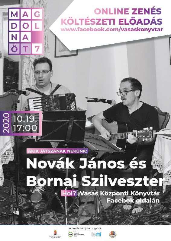 Online térben zenélnek majd a versek Novák János és Bornai Szilveszter közreműködésével 2020. október 19-én, hétfőn 17 órai kezdettel a Magdolna 5-7. sorozat következő előadásaként. A Vasas Könyvtár Facebook oldalán, bárki csatlakozhat!